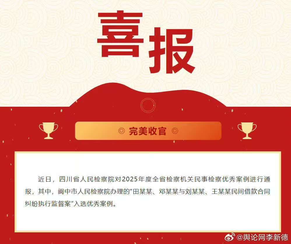 一纸省级民事检察优秀案例的喜报,本应是司法公正的勋章,却化作刺痛受害人田茂平的利刃。2025年末,四川省人民检察院通报的“田某某、邓某某与刘某某、王某某民间借款合同纠纷执行监督案”获评优秀案例。然而,案件受害人田茂平却因阆中法院执行法官马奎玩忽职守、滥用职权,深陷长达6年的维权困境,160万执行款追索无果,已查封的三栋酒店楼房迟迟未启动拍卖,案件因监督失职沦为“僵尸案”。而负责监督的阆中市人民检察院,竟凭此“政绩”斩获殊荣。这纸喜报的背后,是司法监督的缺位,是程序正义的失守,更是对法治精神的公然亵渎。