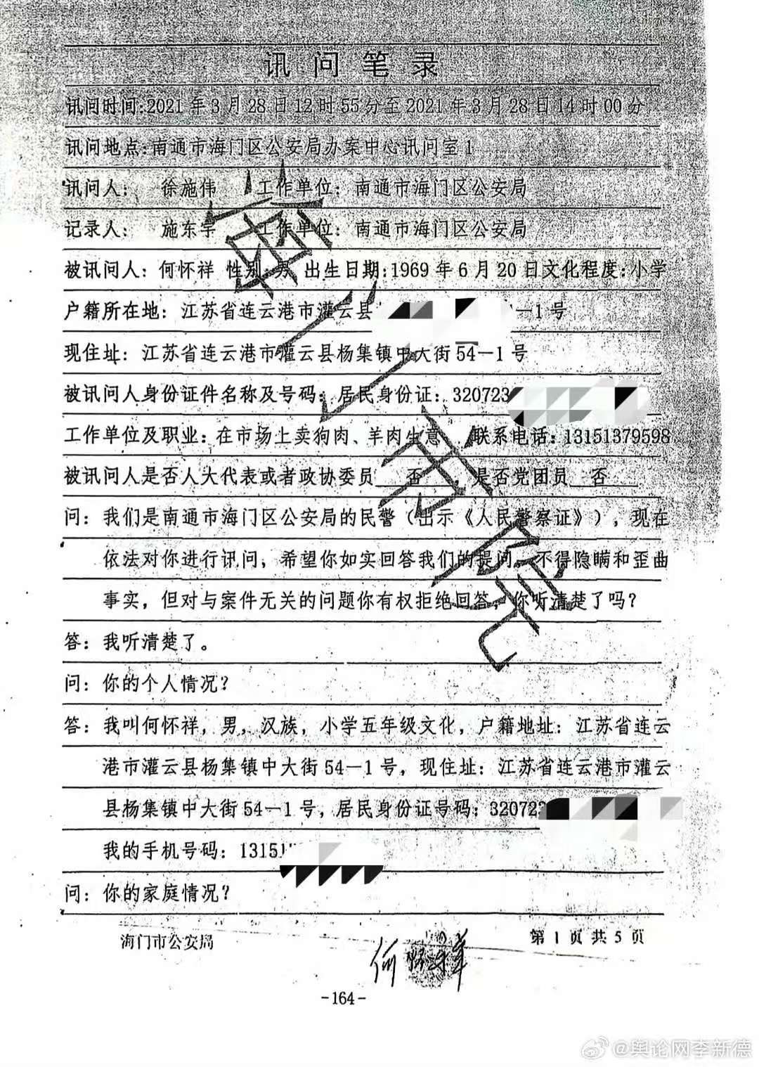 图为何怀祥在海门市公安局的讯问笔录