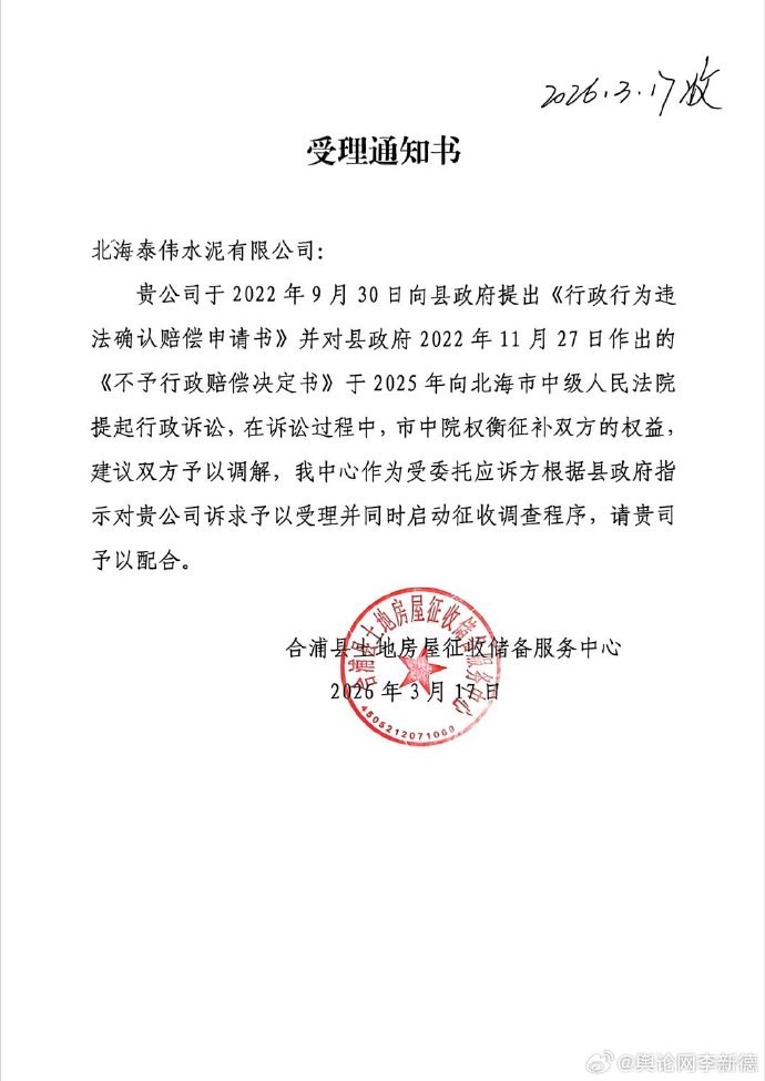 同步推进的是,合浦县土地房屋征收储备服务中心向泰伟公司送达《受理通知书》,明确按照县政府工作指示,受理企业诉求并启动征收调查程序。北海市中级人民法院也已确定于2025年11月21日公开开庭审理此案。