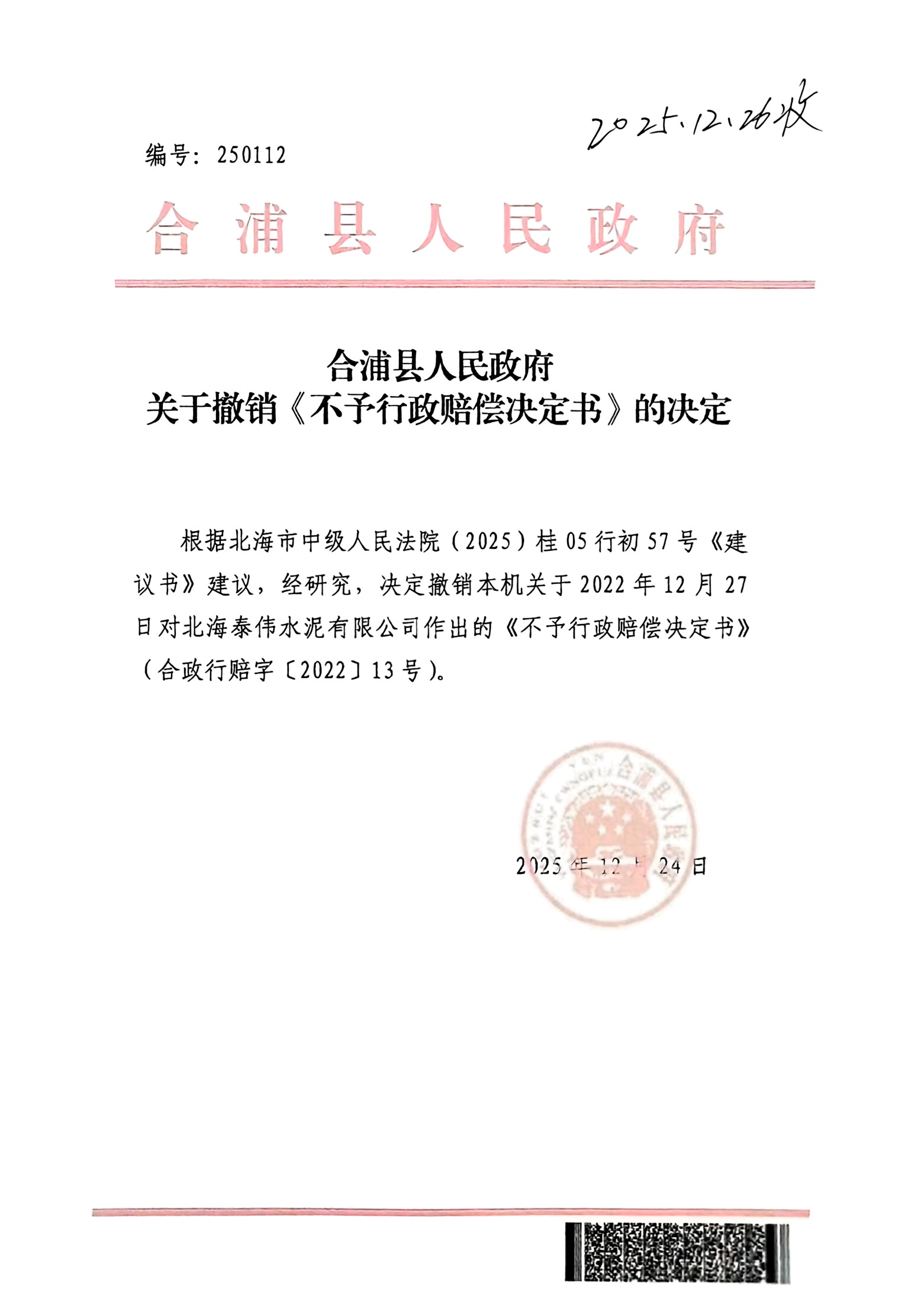 2025年,这起拖延十余年的案件迎来关键转机。因不服合浦县人民政府2022年作出的《不予行政赔偿决定书》,泰伟公司向北海市中级人民法院提起行政诉讼。案件审理过程中,法院秉持公平公正原则,兼顾征补双方合法权益,积极组织调解并提出司法建议。2025年12月,合浦县人民政府依据北海市中级人民法院(2025)桂05行初57号《建议书》,正式撤销案涉《不予行政赔偿决定书》。